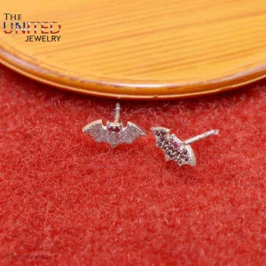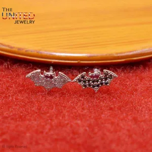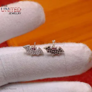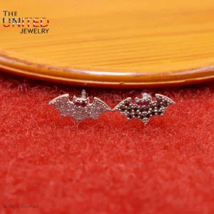 925 Sterling Silver Black & White Diamond Bats Stud Earrings, Silver Ruby Eyes Bats Stud Earrings, Handmade Bats Earrings Jewelry