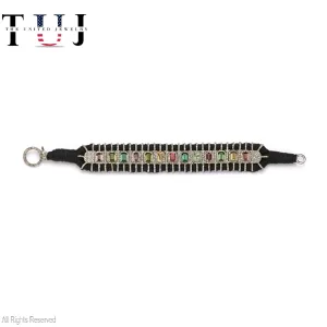 925 Sterling Silver Handmade Black Thread Pave Diamond Multi Color Gemstone Bracelet Jewelry