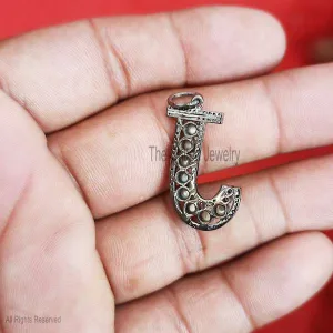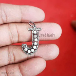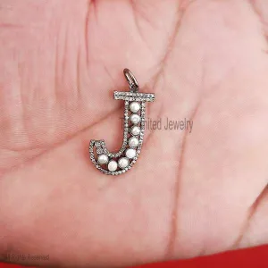 925 Sterling Silver Natural Pave Diamond Handmade J Shape Pearl Monogram Pendant Jewelry, Personalized Silver Monogram Jewelry