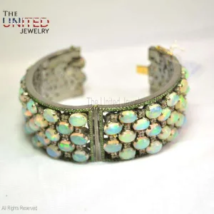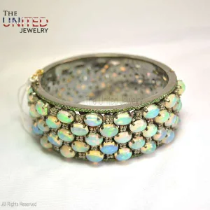 925 Sterling Silver Opal With Pave Diamond Handmade Bangle For Women’s, 925 Silver Designer Opal With Diamonds and Tsavorite Bangle Jewelry For Women’s