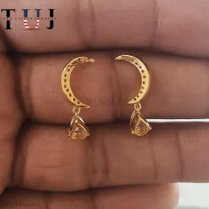 925 Sterling Silver Pave Diamond Half Moon Handmade Dangles Earrings For Women