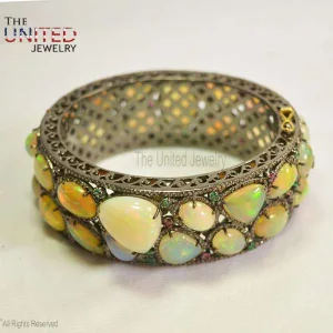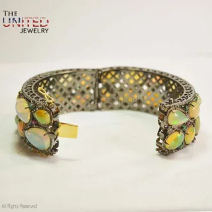 925 Sterling Silver Pave Diamond With Opal Handmade Bangle, Silver Opal Designer Women’s Bangle Jewelry