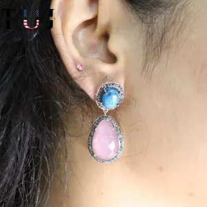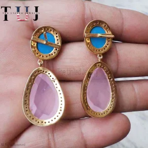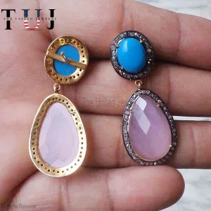925 Sterling Silver Pave Diamond With Pink Onyx And Turquoise Handmade Designer Dangles Earrings For Women