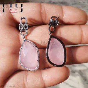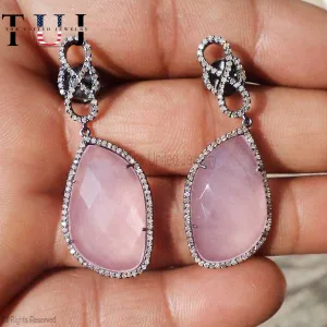 925 Sterling Silver Pave Diamond With Pink Onyx Handmade Dangles Earrings For Women