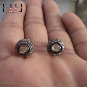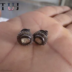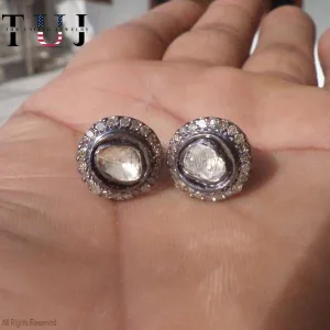 925 Sterling Silver Pave Diamond With Polki Handmade Round Studs Earrings For Women