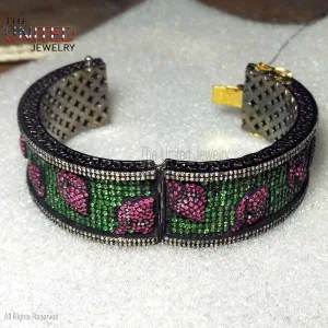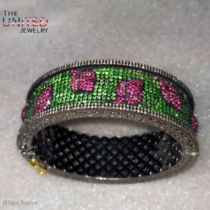 925 Sterling Silver Pave Diamond With Tsavorite And Pink Sapphire Handmade Bangle, Silver Diamond With Tsavorite Women’s Bangle Jewelry