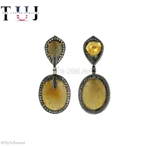925 Sterling Silver Pave Diamond With Yellow Sapphire Handmade Designer Dangles Earrings For Women