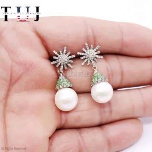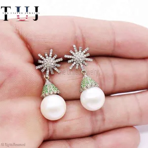 925 Sterling Silver Pearl With Pave Diamond And Tsavorite Handmade Dangles Earrings For Women