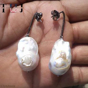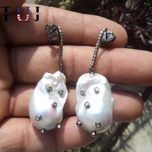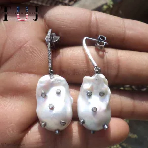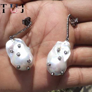 925 Sterling Silver Pearl With Pave Diamond Handmade Dangles Earrings For Women