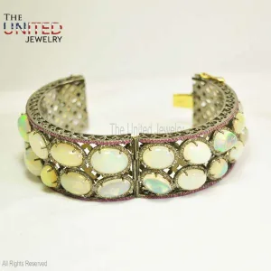 925 Sterling Silver Pink Sapphire With Opal Handmade Bangle, Silver Opal Designer Women’s Bangle Jewelry