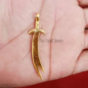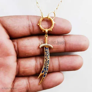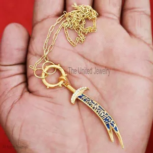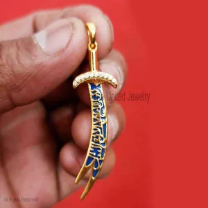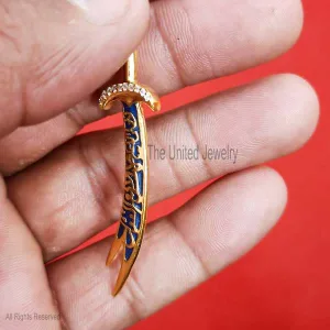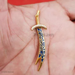 Blue Enamel Imam Ali Sword Yellow Gold Plating Sterling Silver Diamond Jewelry, Silver Sword Pendant, Diamond Sword Pendant, Silver Handmade Jewelry