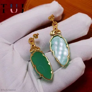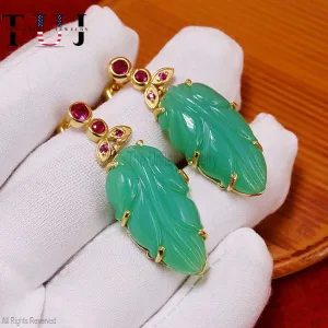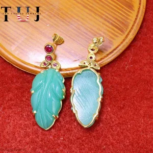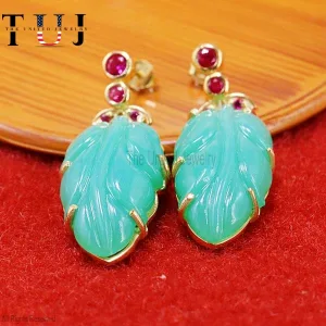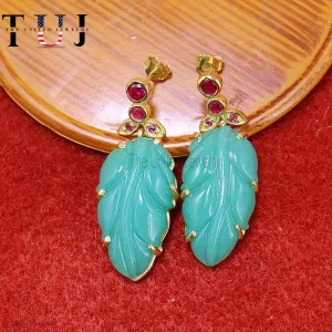 Craved Chrysoprase Pink Sapphire Leaf Dangles 925 Sterling Silver Earrings