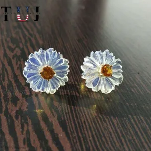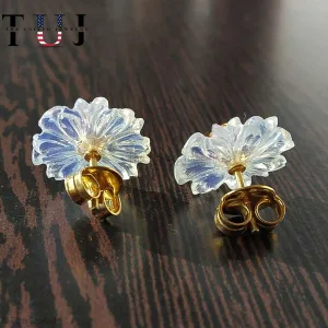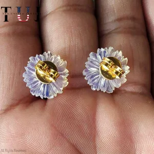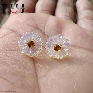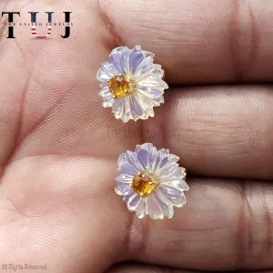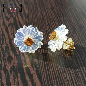 Crystal Carved Flower Sterling Silver Studs Earrings, Carved Gemstone Flower Women Studs, Carved Gemstone With Yellow Sapphire Stud Earrings