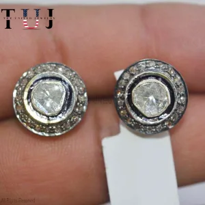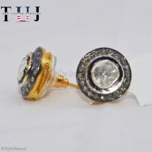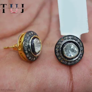 Handmade 925 Sterling Silver Pave Diamond With Polki Round Studs Earrings For Women