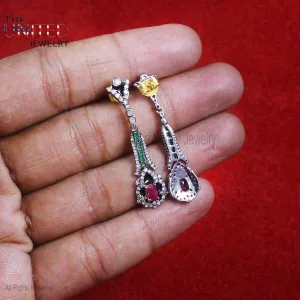 Natural Pave Diamond Dangle Earrings, Emerald and Blue Sapphire Dangle Earrings, Handmade Silver Dangle Earrings