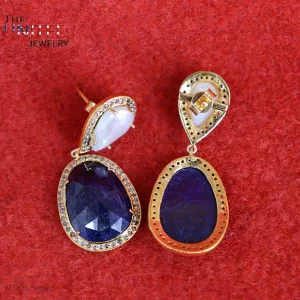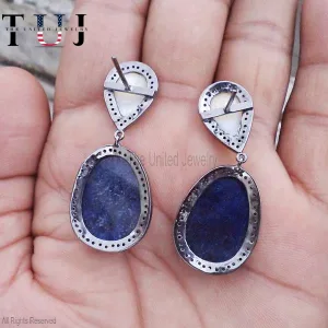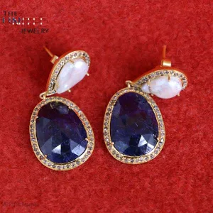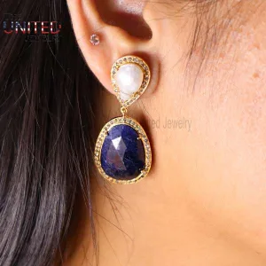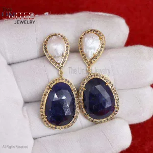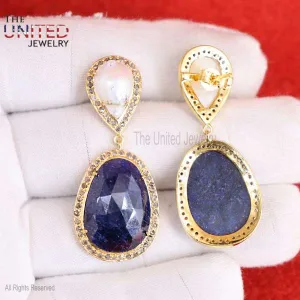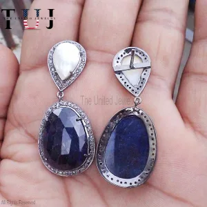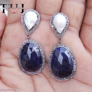 Natural Pave Diamond Pearl Earrings Jewelry, Sterling Silver Blue Sapphire Earrings Jewelry, Silver Pearl Earrings