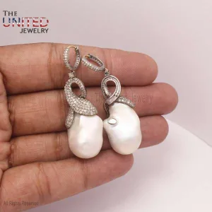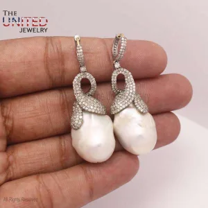 Natural Pave Diamond Sterling Silver Pearl Dangle Earrings, Silver Earrings, Diamond Silver Earrings Jewelry