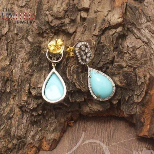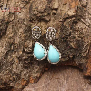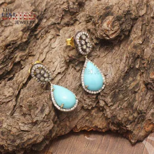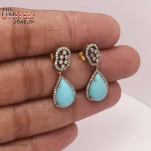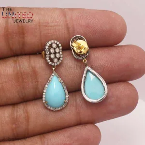 Natural Pave Diamond Sterling Silver Turquoise Dangle Earrings, Silver Earrings, Diamond Silver Earrings Jewelry